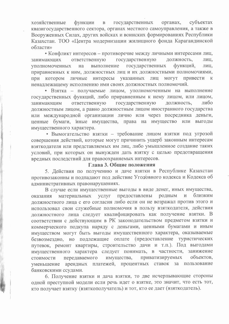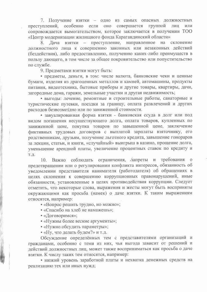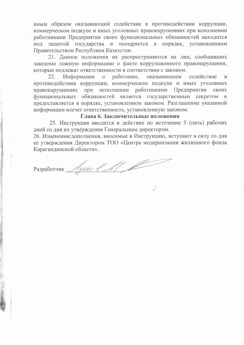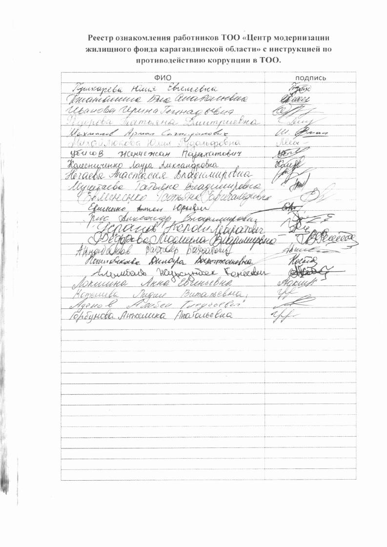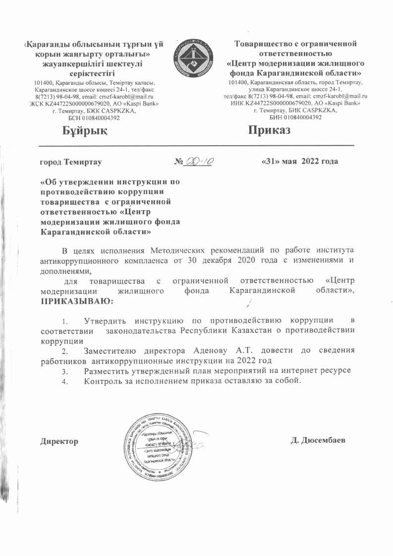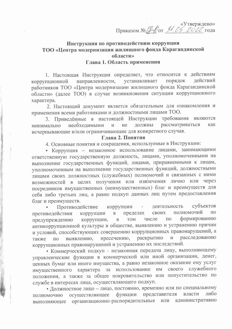 Об утверждении инструкции по противодействию коррупции ТОО Центр модернизации жилищного фонда Карагандинской области