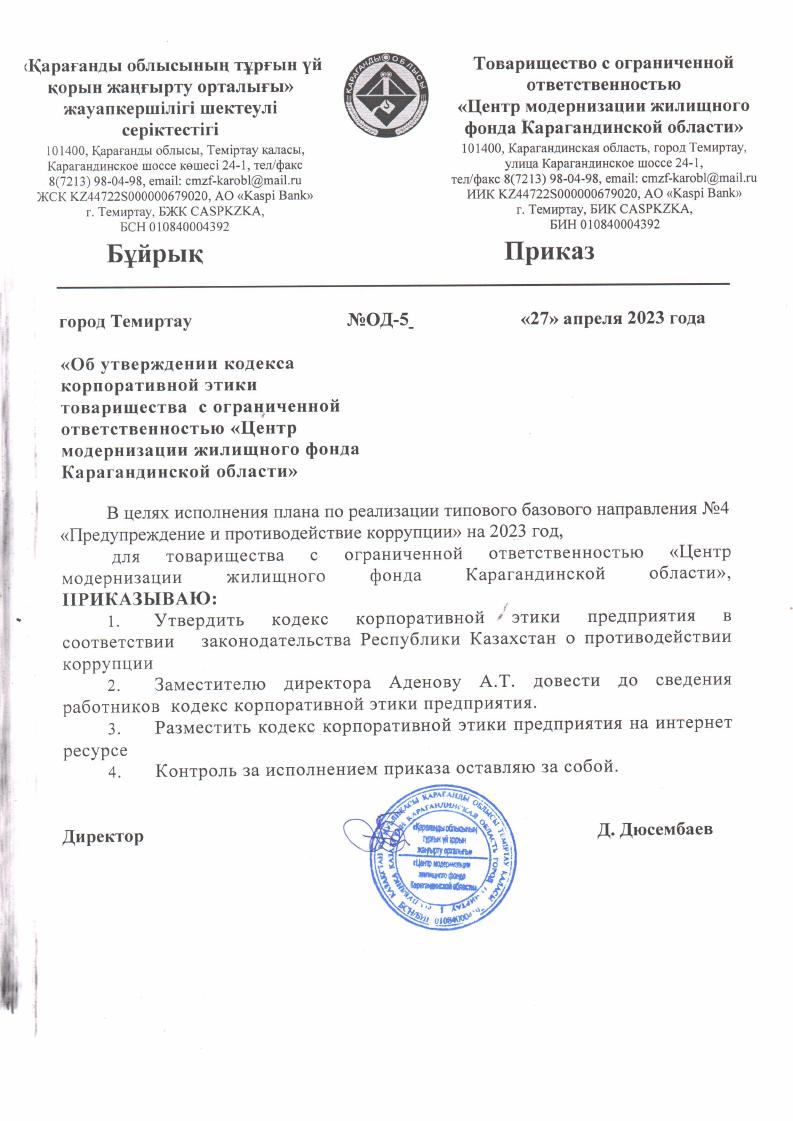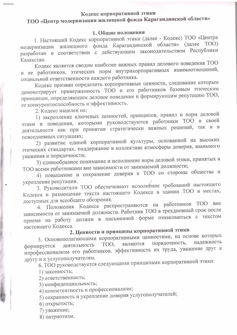 Об утверждении кодекса корпоративной этики ТОО Центр модернизации жилищного фонда Карагандинской области