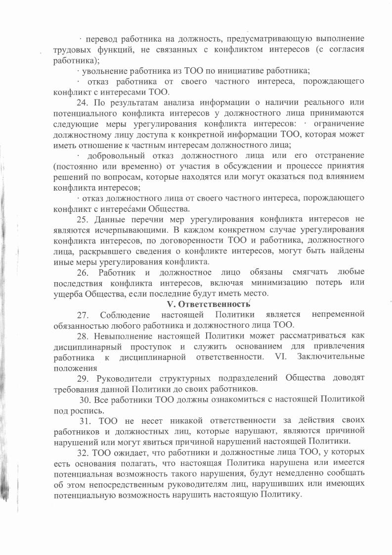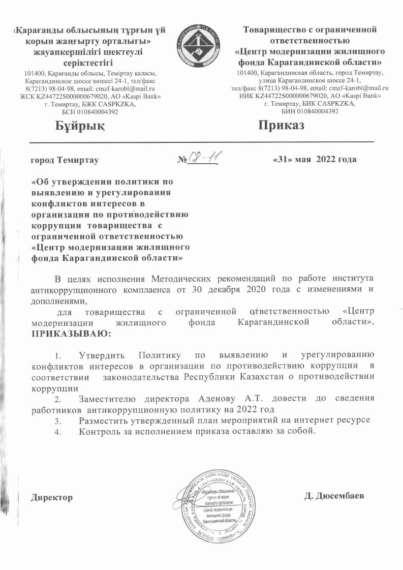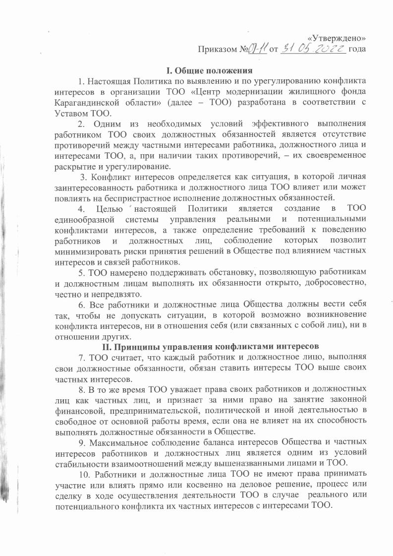 Об утверждении политики по выявлению и урегулирования конфликтов интересов в организации по противодействию коррупции ТОО Центр модернизации жилищного фонда Карагандинской области