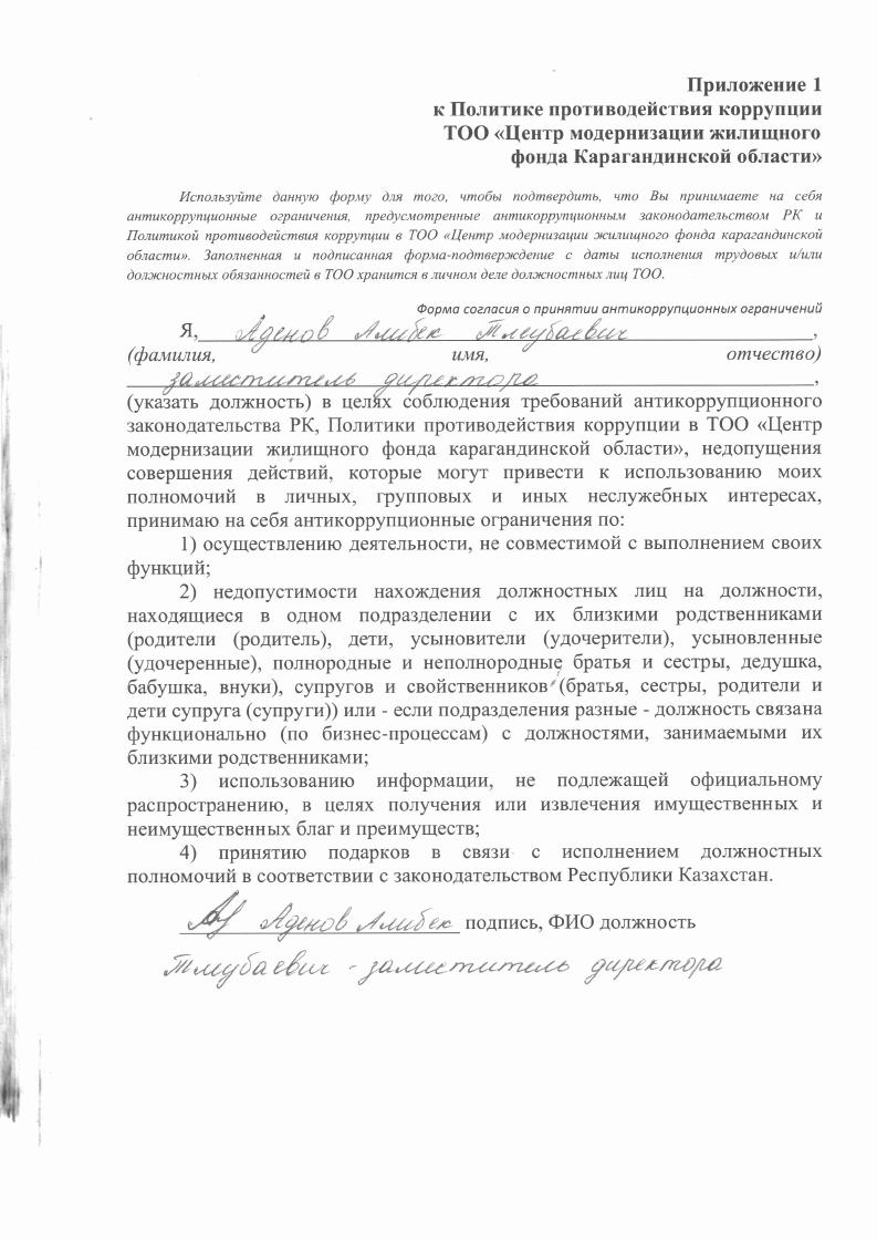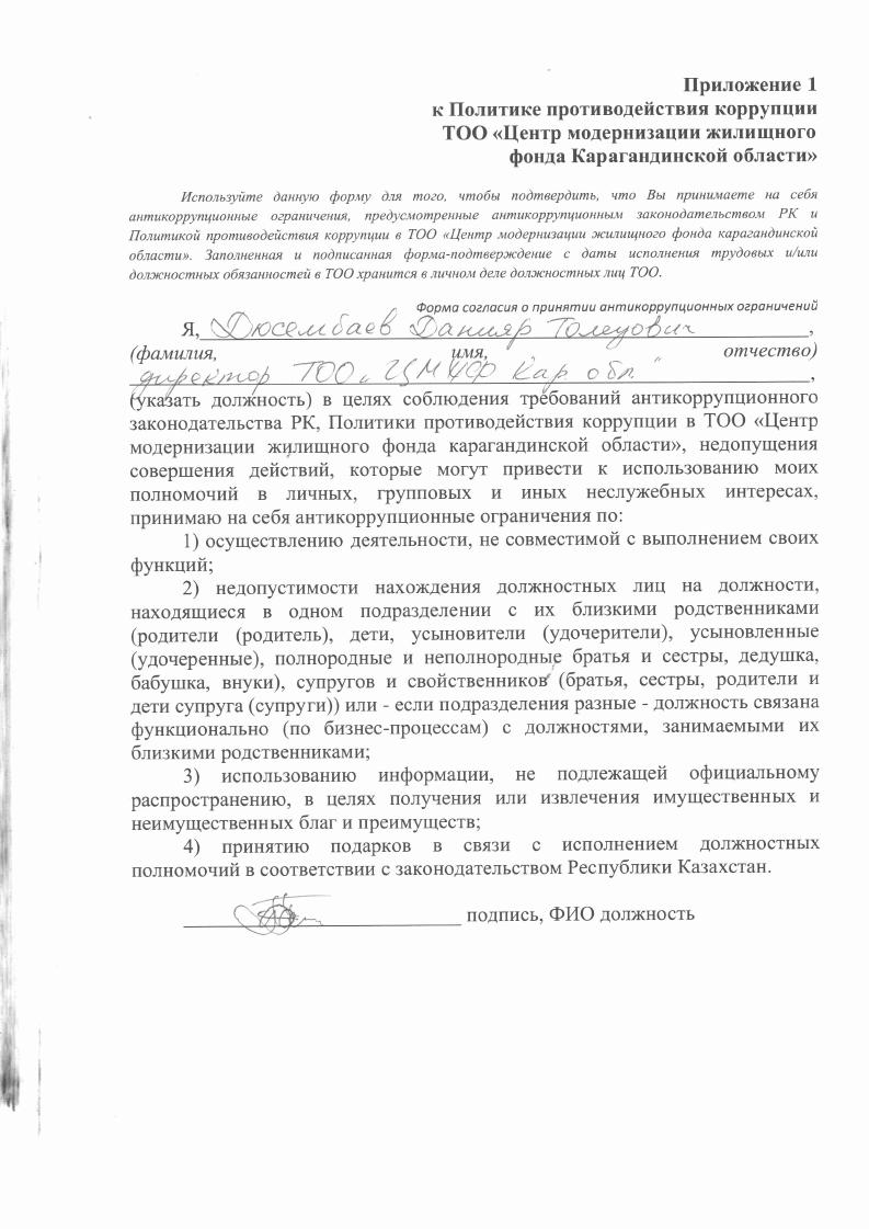 Предыдущий: О возложении функции антикоррупционной комплаенс-службы по ТОО Центр модернизации жилищного фонда Карагандинской области